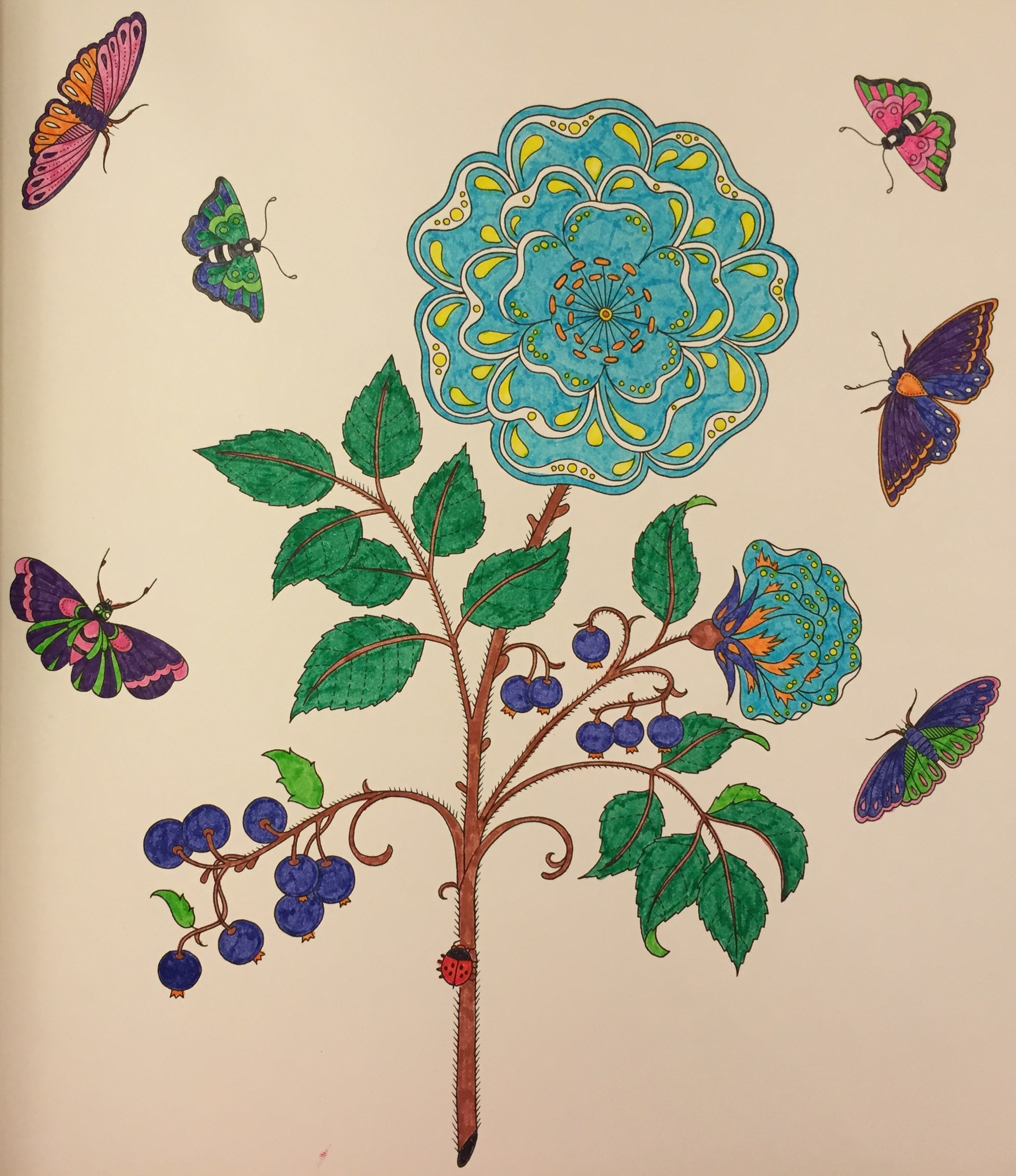 I’m totally in awe of the talents of Johanna Basford. I looked her up online and found her delightful website here. She has a Colouring Gallery where anyone can upload their finished pictures here, which is great to look at and get ideas. This girl from Scotland has an amazing talent I’m glad I get to benefit from.